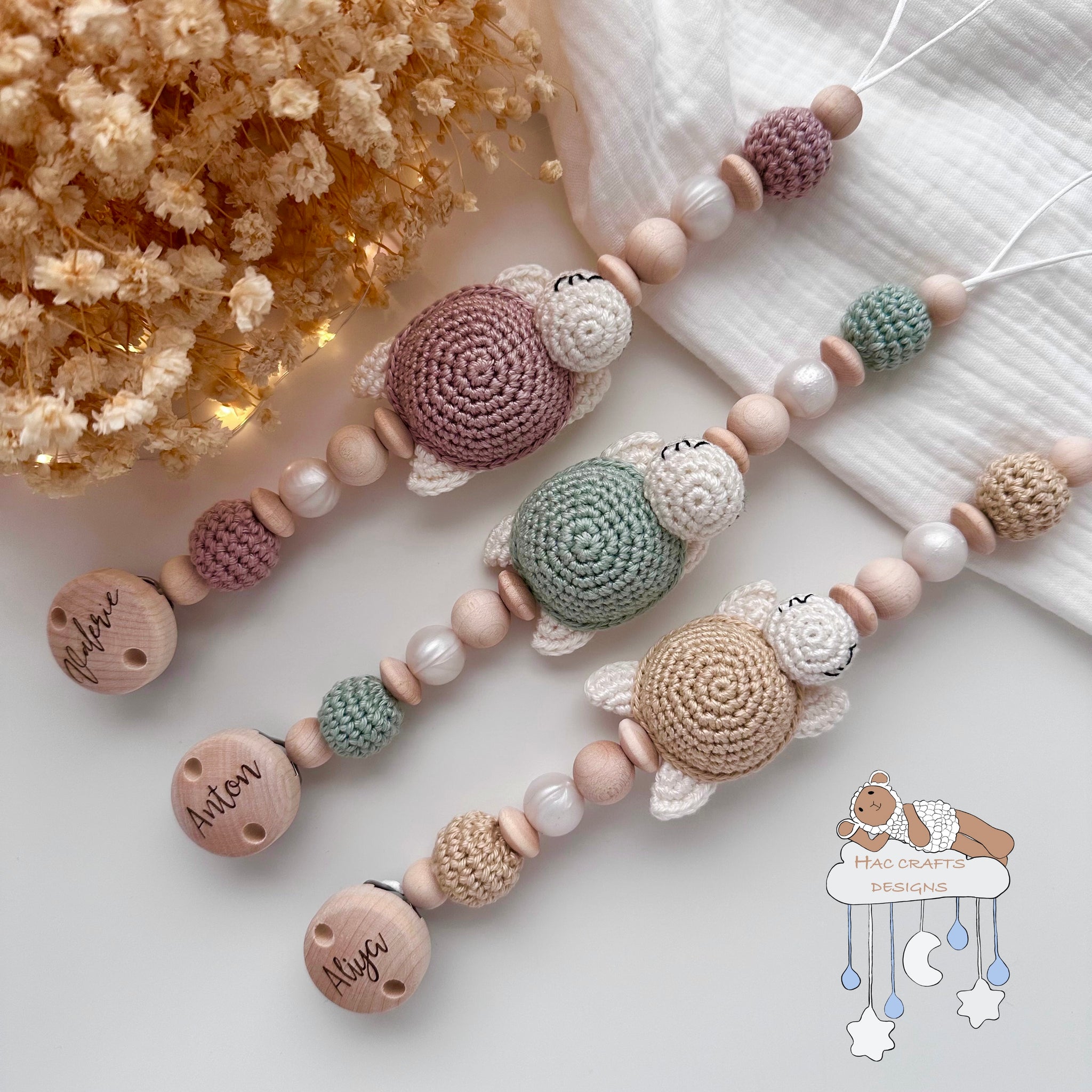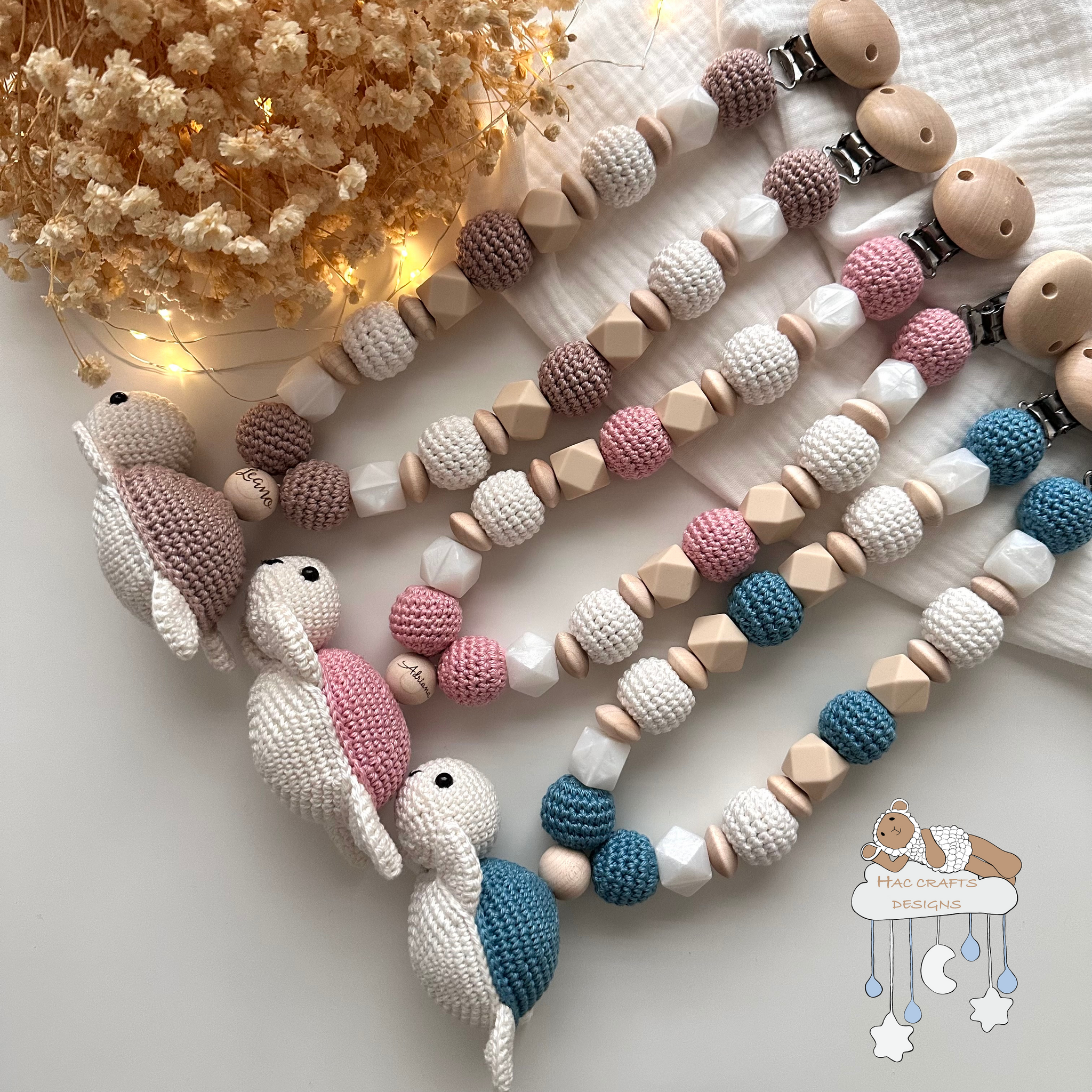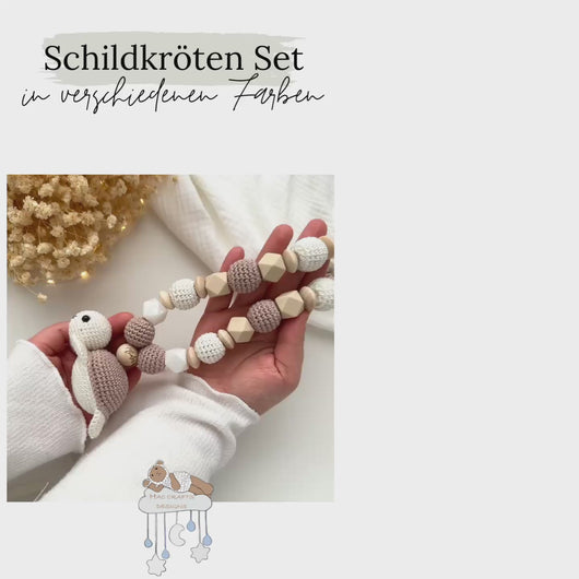 •Das Set besteht aus 4 Teilen: Schnullerkette ,Anhänger ,Rassel und Kinderwagenkette. Diese kann man natürlich auch einzeln kaufen.