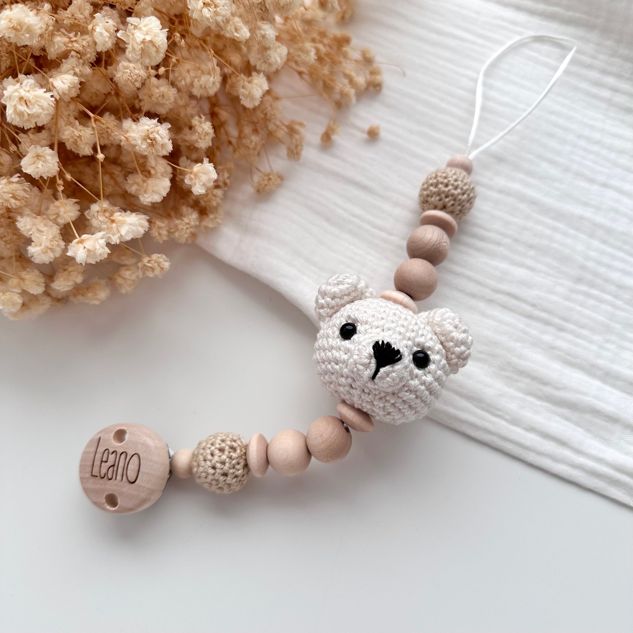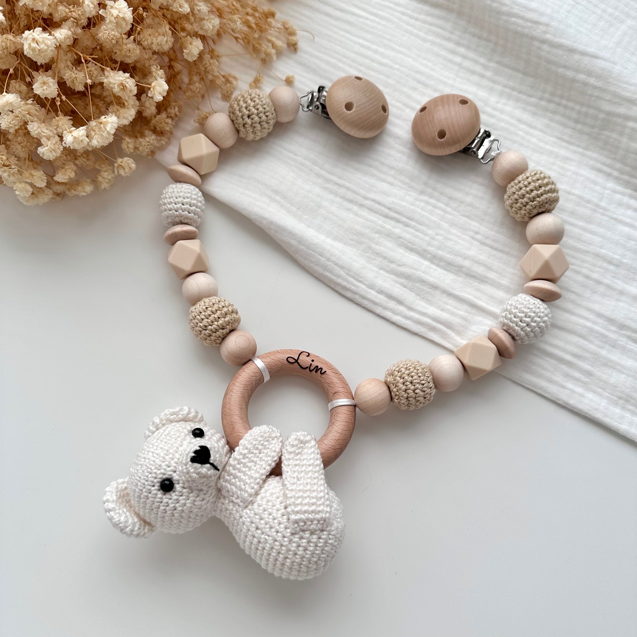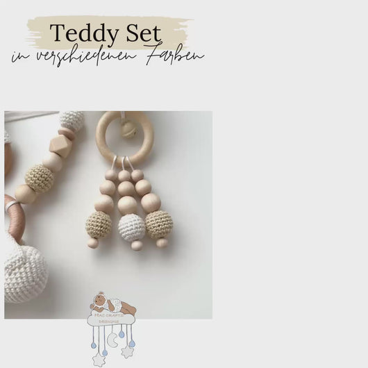 •Das Set besteht aus 4 Teilen: Schnullerkette ,Anhänger ,Rassel und Kinderwagenkette. Diese kann man natürlich auch einzeln kaufen.